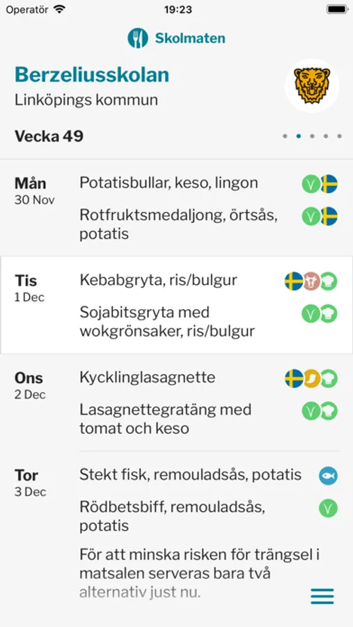 - Se skolmaten för nuvarande, förra och de kommande veckorna.