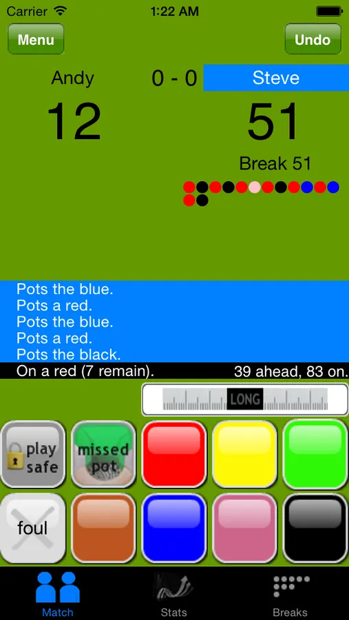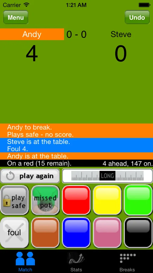 - the app knows all the rules - respots, foul and a miss, multiple reds in one shot, re-racks, skip the last black when the frame is already won, concede or end frame early - but with the flexibility to record every eventuality.