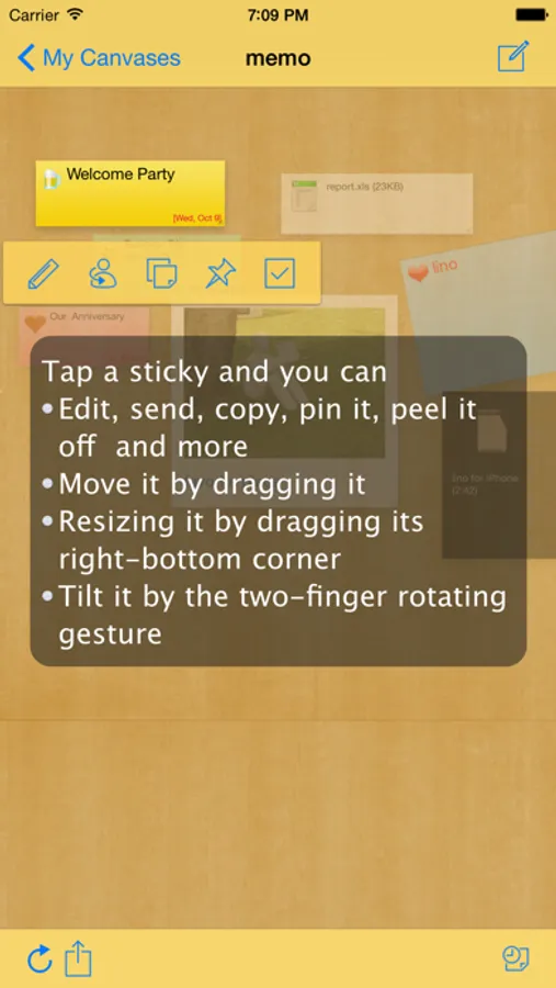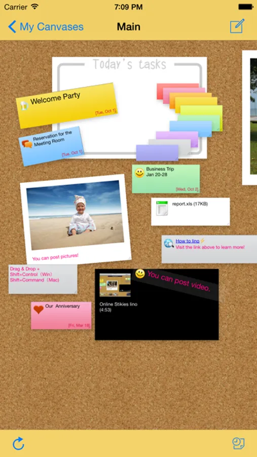 You can freely post memos, pictures and videos you take with your iPhone, and even files as stickies on a canvas. Stickies posted while you're offline will appear once you're online.