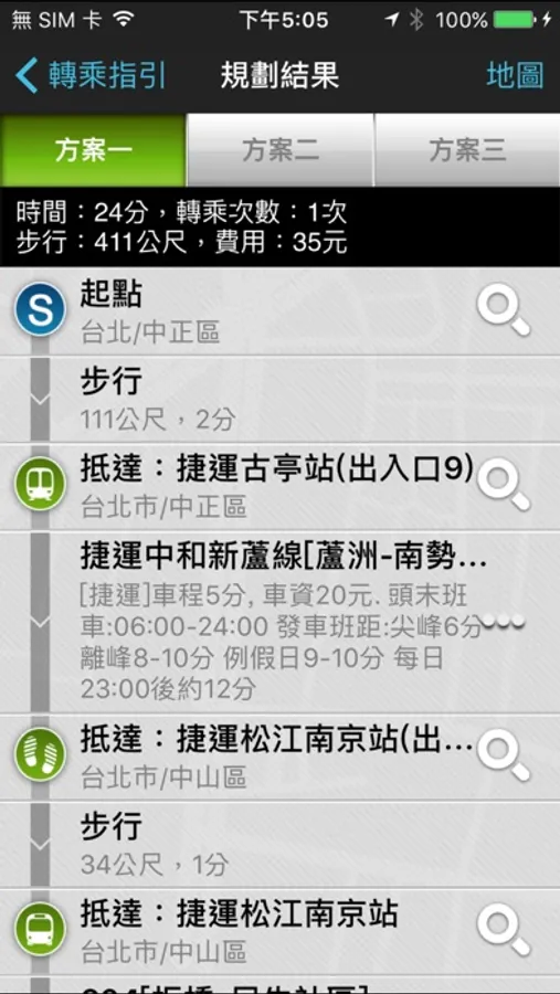 可規劃轉乘起點與終點,提供一到三種轉乘方案及所需時間、票價等,讓您輕鬆選擇。
