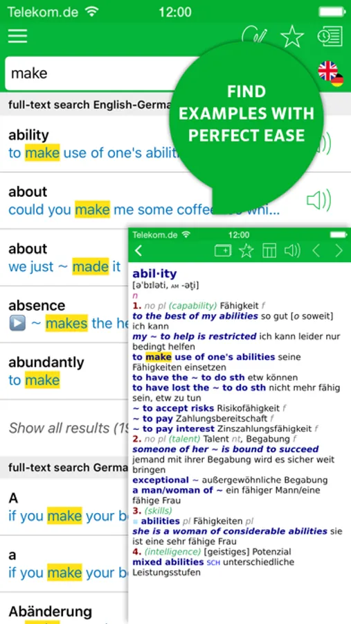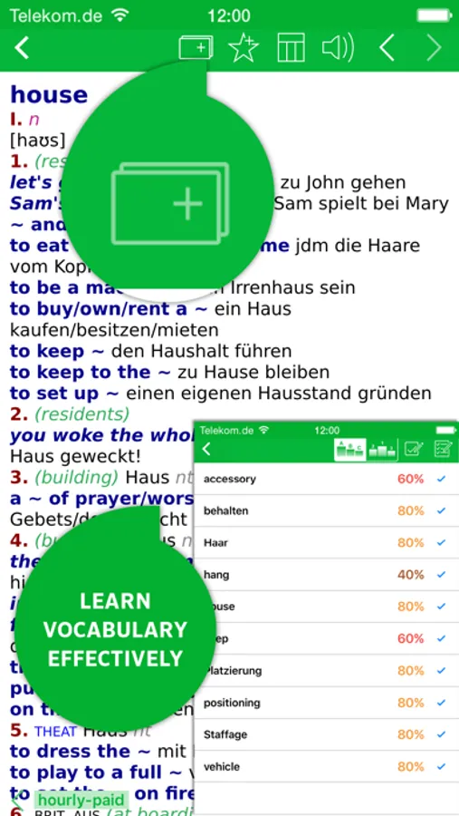 • Listen to numerous keywords spoken by native speakers and practise your pronunciation: available for German, English, French, Spanish, Italian, Russian.