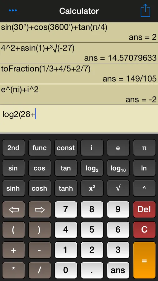 - functions: sin, cos, tan, cot, sec, csc, sinh, cosh, tanh, coth, asin, acos, asec, acsc, atan, acot, asinh, acosh, atanh, acoth, log2, log10, ln, logn(n,x) (log x with base n), √, ³√, abs, avg, ceil, floor, round, deg2rad, rad2deg, max, min, sgn, lcm, gcd, nCr, nPr, arg, real, imag, conj, polar