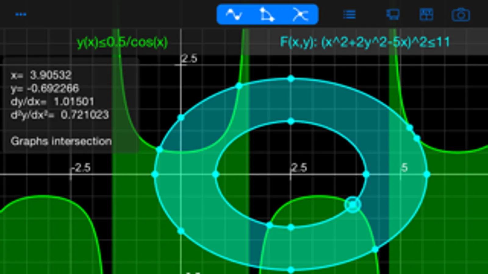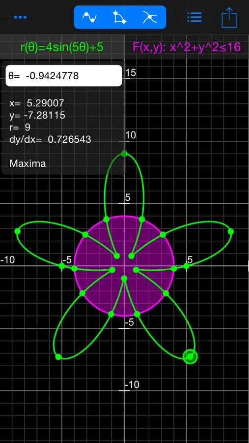 - cartesian y(x) and x(y), polar r(θ) graphs (parametric x(t)y(t) and implicit in Pro version)