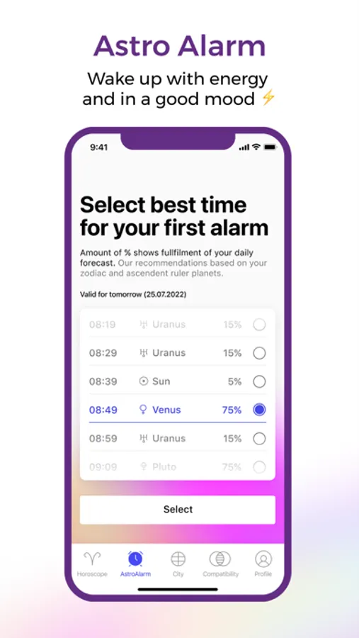 Did you know that you have your very own ruler planet? It’s Mercury, Venus, Mars, Ceres, Jupiter, Saturn, Uranus, Neptune, or Pluto. We can determine the position of your ruler planet, as well as your rising zodiac sign, and predict the phases the planets will go through to help you find the right time to fall asleep and wake up every day! Follow the suggested pattern and enjoy better rest with our Zodiac Astro Alarm.