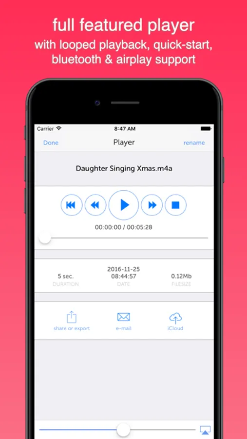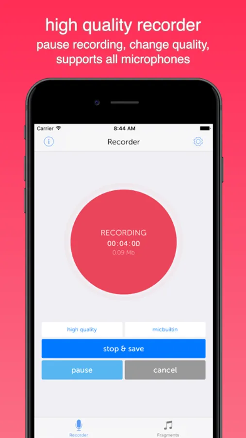 Every day over 1.500 audio recordings are made with Instant Audio Recorder! Record, Play and Share high quality audio fragments with this beautiful and intuitive audio recorder. With optimized user experience for both iPhone and iPad and iOS10.