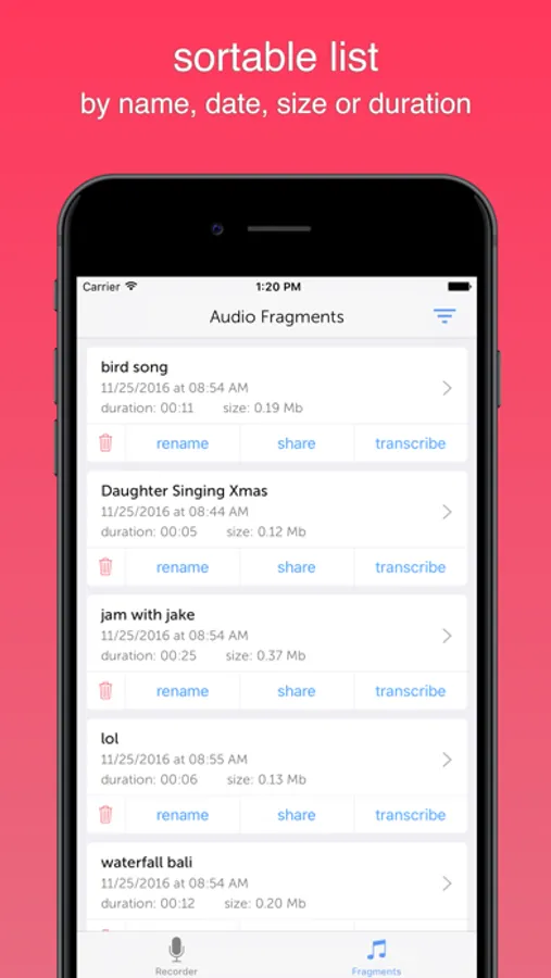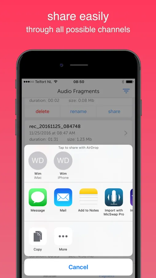 - Open recorded audio fragments directly with other apps (for example an audio editor or WhatsApp)