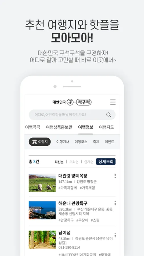 1) 전국 여행기사, 관광지, 음식점, 숙박 등 약 3만여 건의 관광정보 서비스 제공