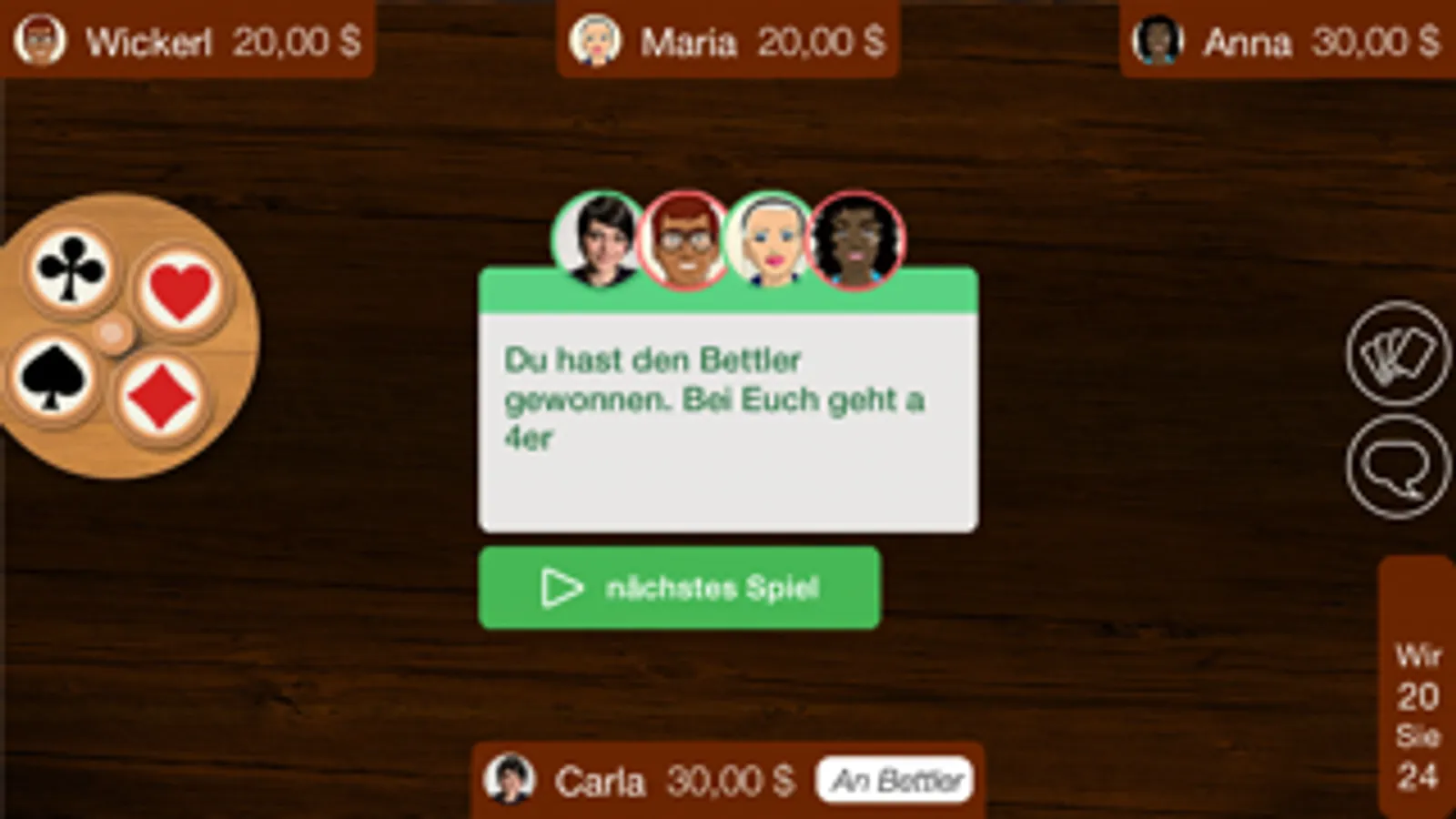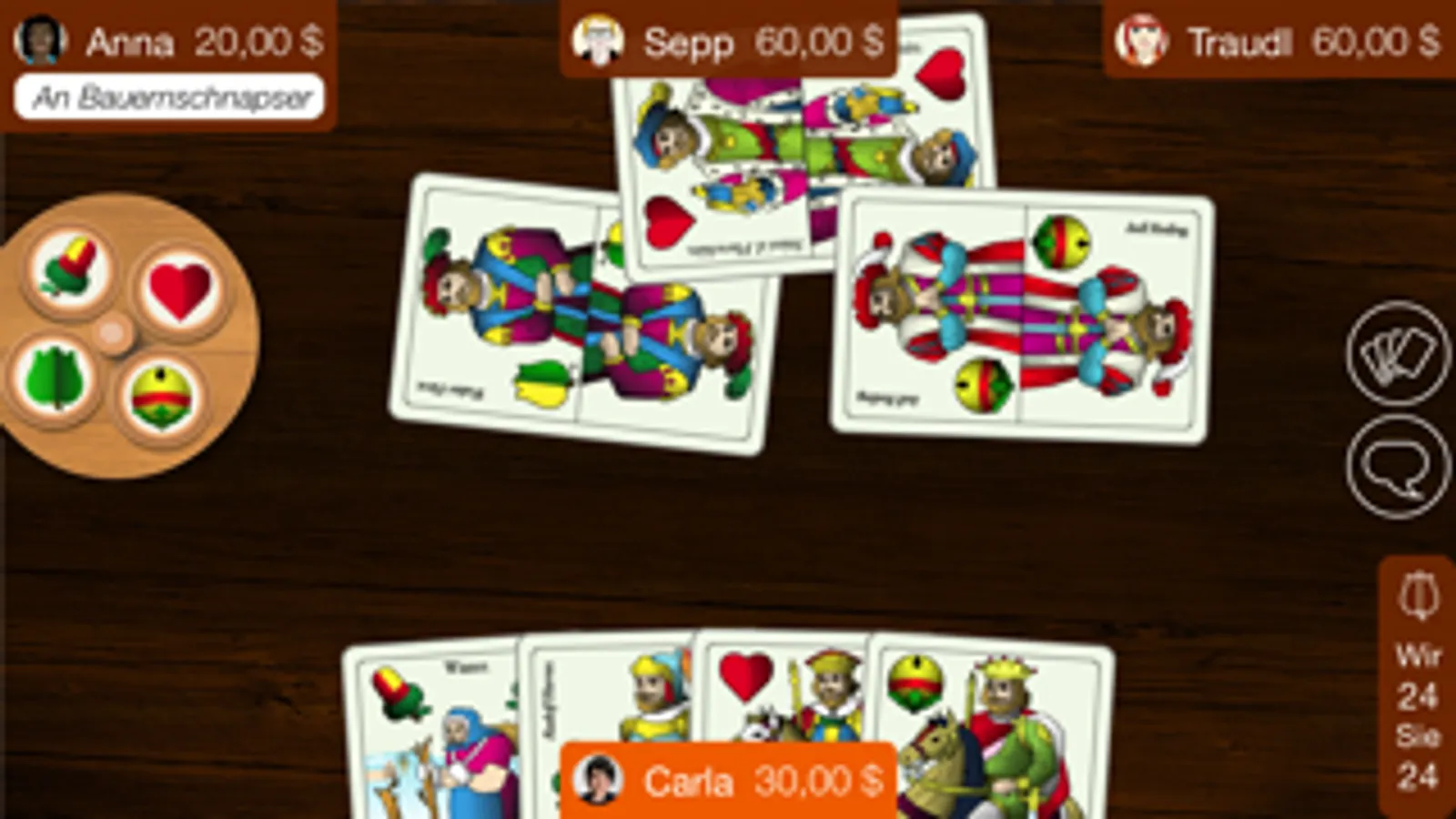 Dabei ist alles so einfach wie am echten Spieltisch: Man klickt auf den Chat und sendet ein Servas an die Mitspieler. Mit dem Finger schiebt man die Karten zur Tischmitte und für die Ansagen Zwanz’ger und Vierz’ger greift man zum Fassl. Zuadraht wird ganz einfach indem man die Atoutkarten am Talon dreht und für die einzigartig zünftige Atmosphäre gibt eigens vertonte Spielansagen und die echten Schnapsen-Karten – französisch oder doppeldeutsch!