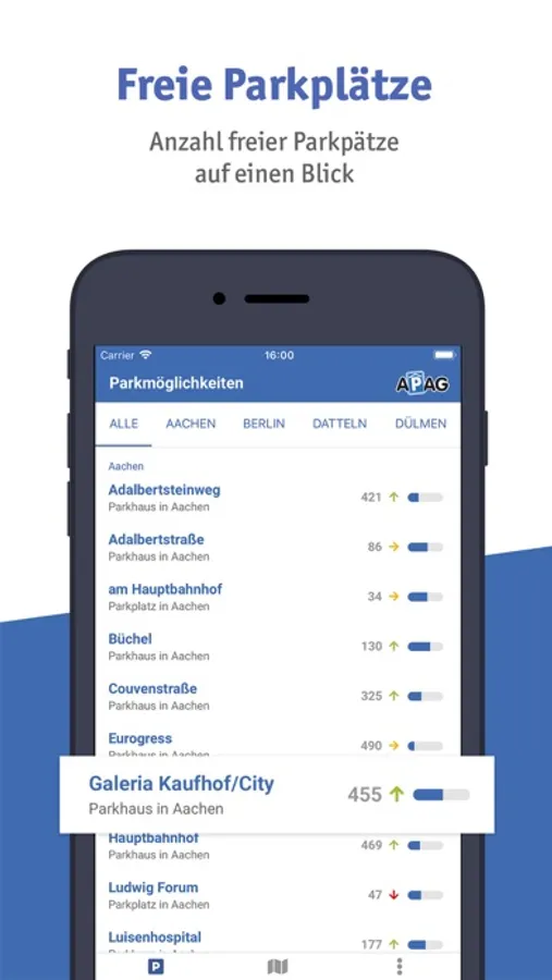 * Anzahl der freien Parkplätze in allen APAG-Parkhäusern in Aachen, Berlin, Datteln und Dülmen