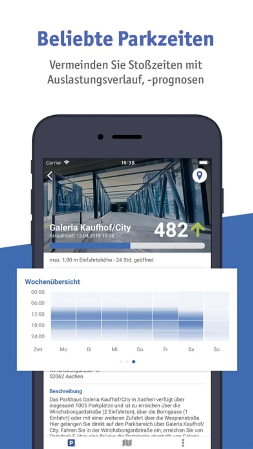 „Parken bei der APAG“ zeigt Ihnen in Echtzeit die Anzahl freier Parkplätze in den APAG-Parkhäusern auf Ihrem Mobilgerät und hilft Ihnen so, das richtige Parkhaus anzusteuern. Zu jedem Parkhaus finden Sie Tarif-, Auslastungs- und Serviceinformationen.