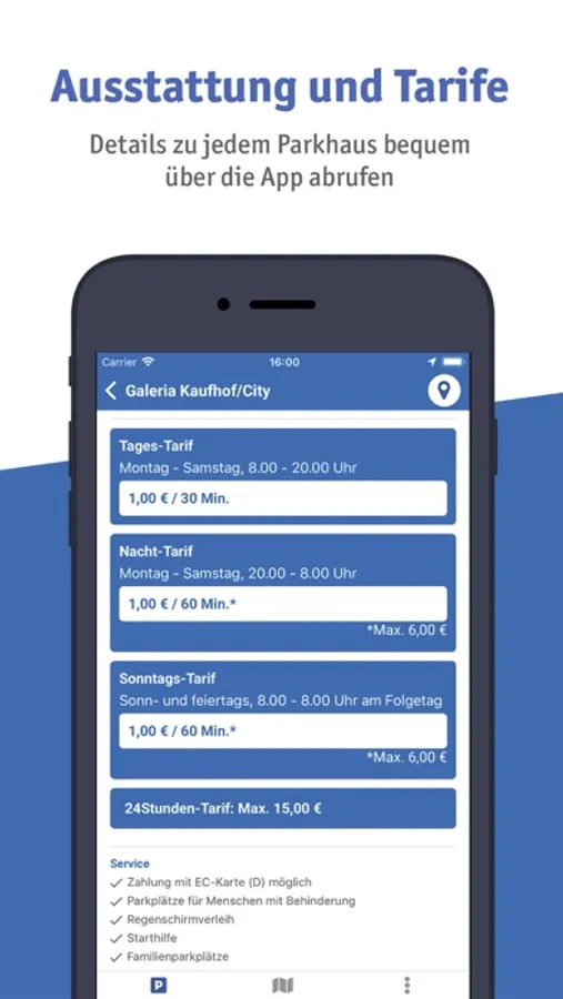 * Details zur Ausstattung und den Serviceleistungen des jeweiligen Parkhauses