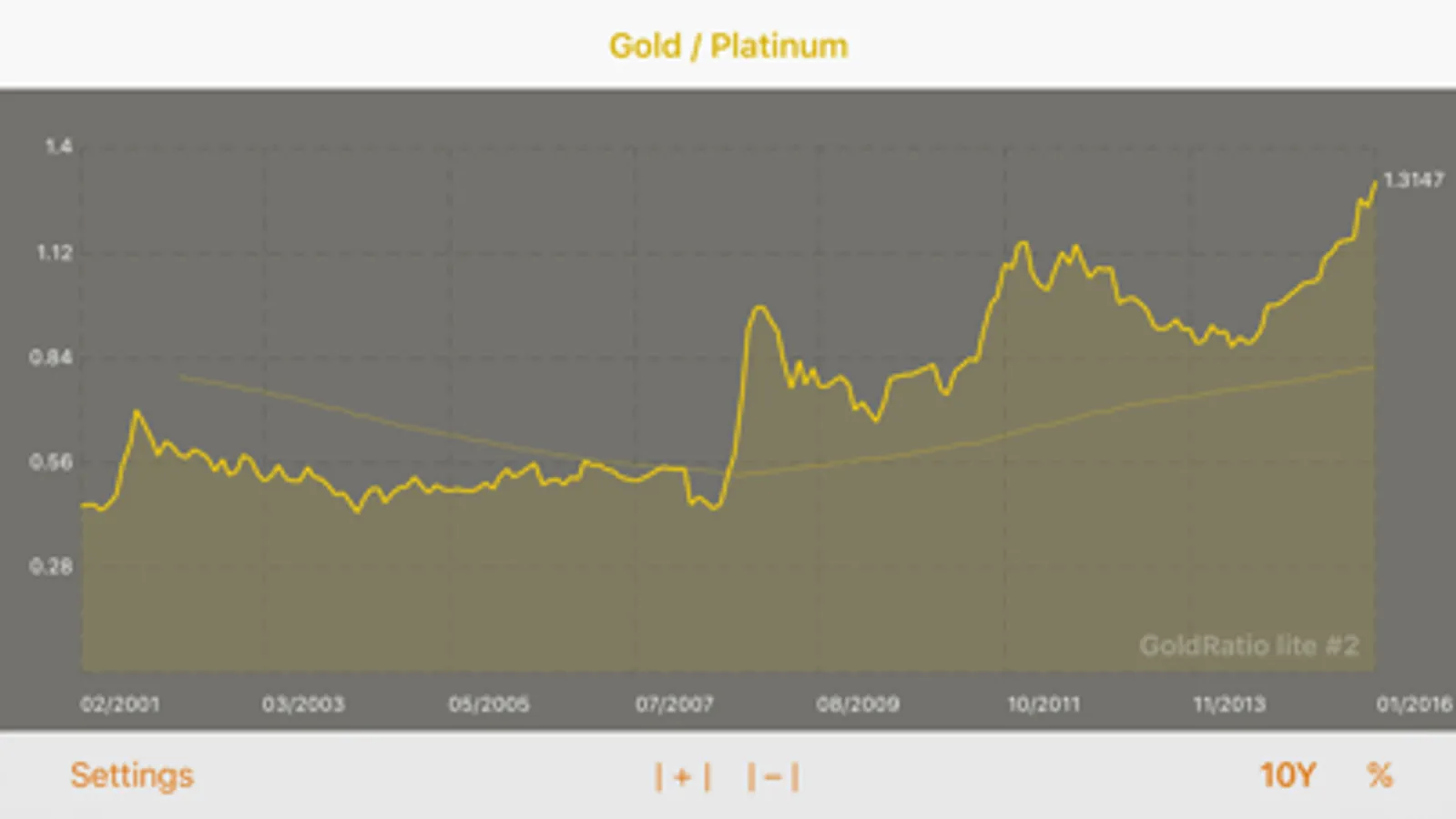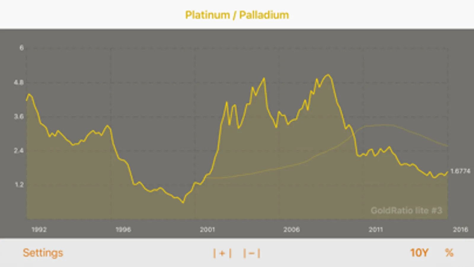 It draws ratio charts of five different commodities (gold, silver, platinum, palladium and crude oil). For example gold/silver ratio or gold/oil ratio.