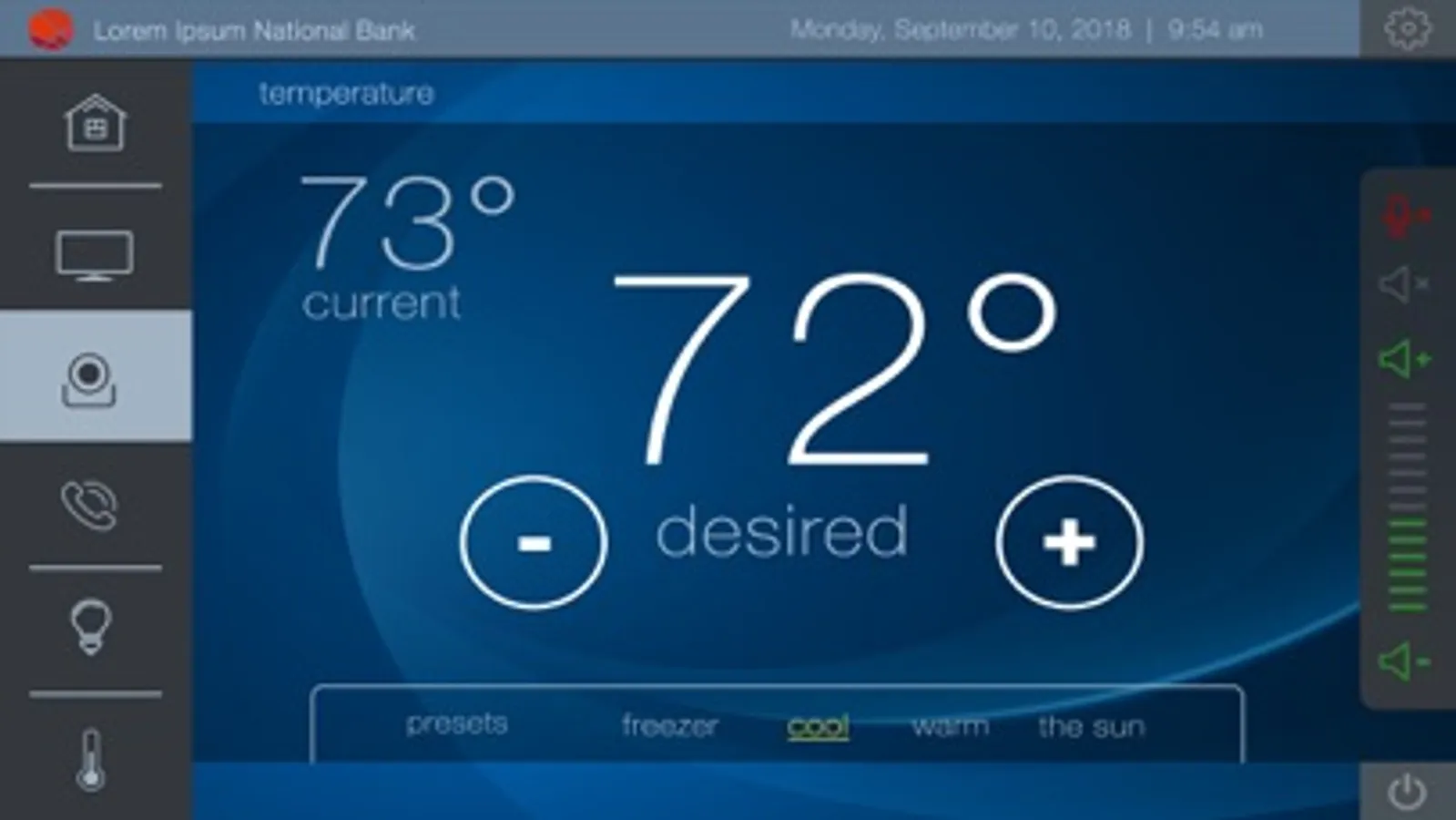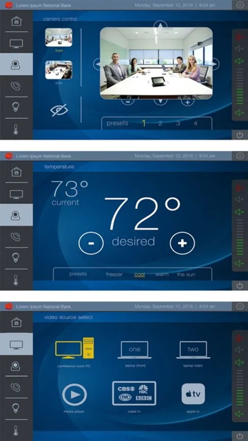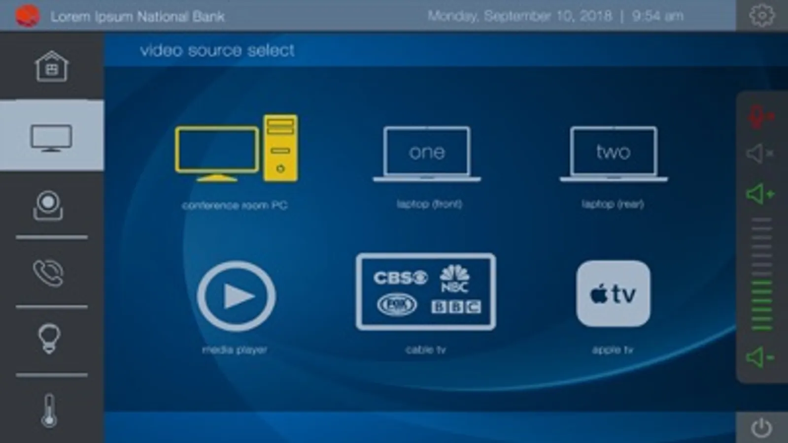 Control Q-SYS systems from your iOS device! Within Q-SYS Designer software, user control interfaces (UCIs) can be created, and nearly any element in the system can be placed in the UCIs for control and monitoring. This enables a near limitless array of control capability, all from your iOS device, including source selection buttons, Q-SYS PTZ camera controls (with video preview frames), lighting dimmer controls, projector on/off selector, signal meters, screen up/down, snapshot recall, volume control faders, and more.