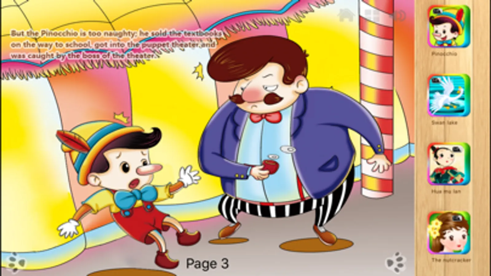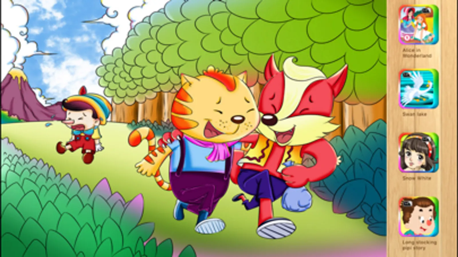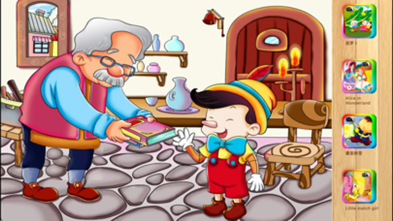 Classic story in new multimedia form: realistically designed story book, with unique sound and animation. Your children can interact with characters inside. Sliding the scene inside the window, saving the pinocchio in the river, hit the hateful cat... incredible digitally-redesigned pages with every detail inside.