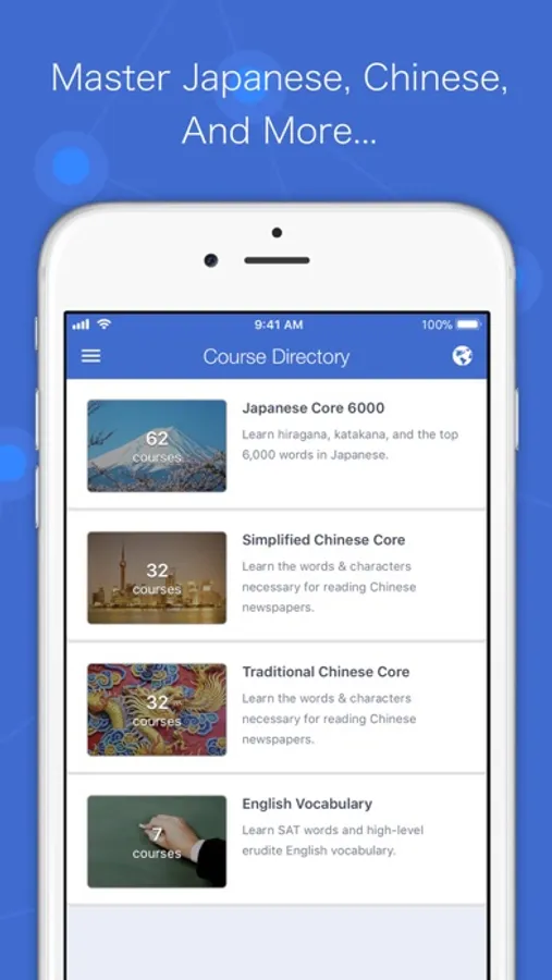 Official courses are offered for studying Japanese, Chinese, and SAT English. The Japanese courses cover the 6,000 most commonly used words in Japanese. The Chinese courses cover the 2,000 most commonly used words in spoken Chinese and over 1,200 words commonly used in newspapers and magazines. (All Chinese courses are available in both Traditional and Simplified Chinese.) All words have sample sentences and audio.