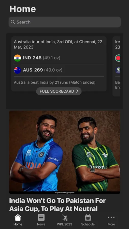 In this cricket app, you can view live scores, ball-by-ball commentary, and match updates. Includes news, photos, videos, and player statistics.
