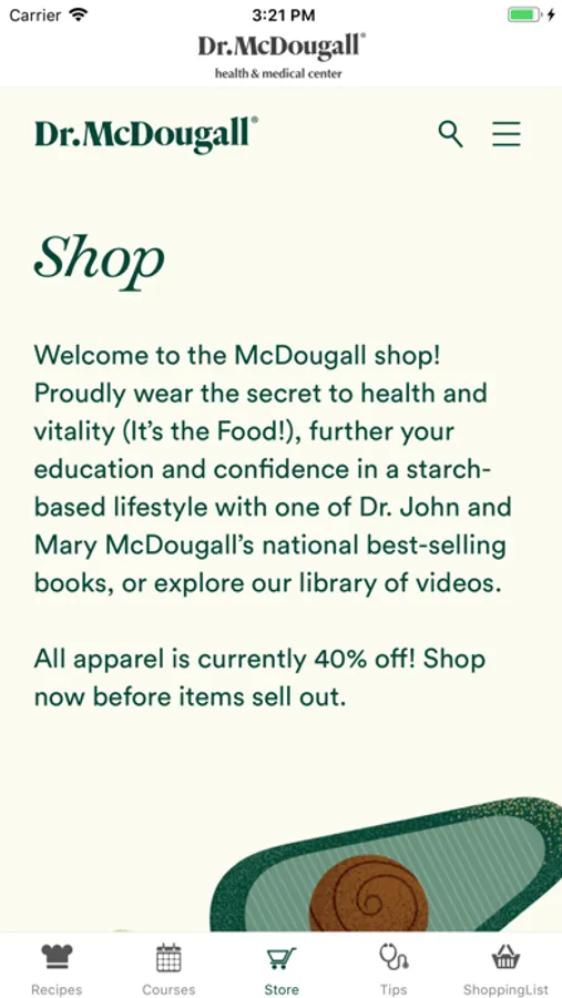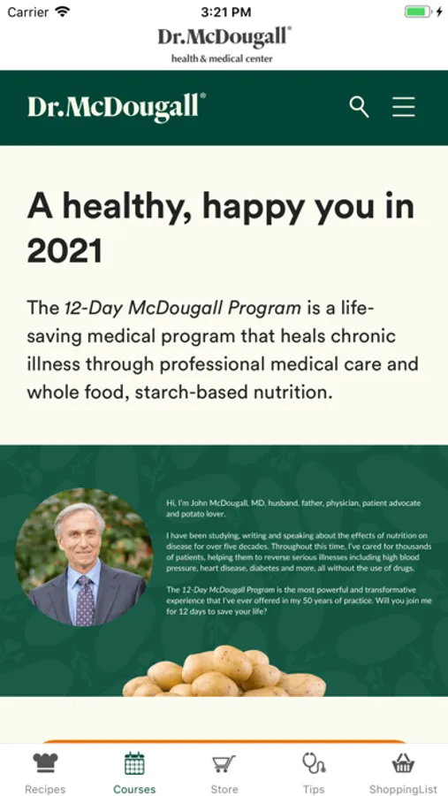 The McDougall Cookbook contains over 1,000 healthy recipes. The app has health tips, featured recipes, a shopping list, and a favorites section. You can also access the latest McDougall course information and the McDougall store where books, ebooks, videos, and apparel can be purchased.