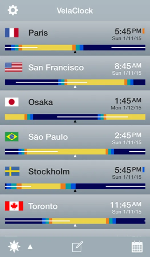 At a glance, VelaClock shows whether a city is currently in daylight, twilight or night. White text indicates daylight (sun is above horizon) and black text indicates night (sun is below horizon). A twilight indicator (a small colored rectangle) will appear to the right of the time when the city is in twilight.