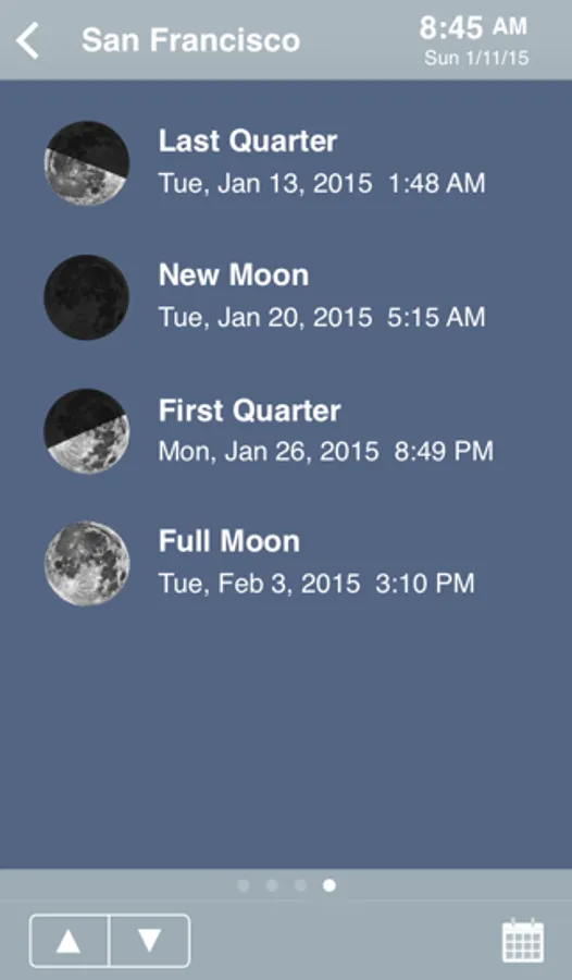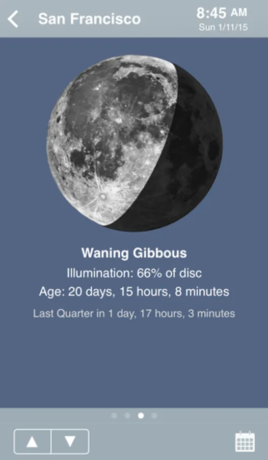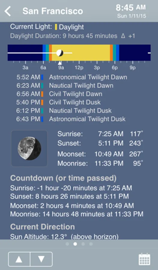 The date/time can be changed by tapping on the calendar icon in the toolbar. Incrementally move a day, an hour, a minute or a week in the future or the past. Arbitrarily jump to any date or time, years in the future or the past. Changing the date allows one to determine when a sunset or full moon will occur in the future or the past.