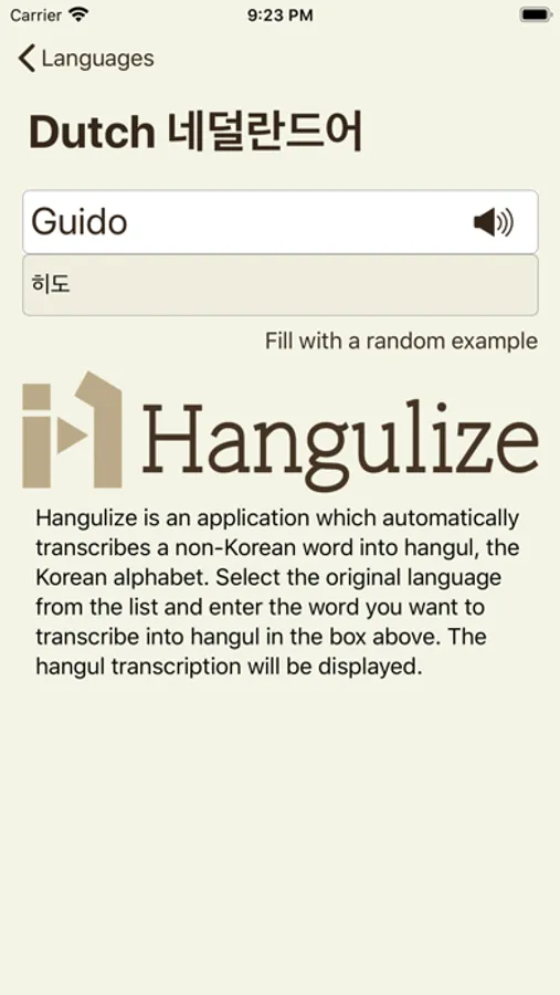 Hangulize는 자동으로 외래어를 한글로 변환해주는 프로그램입니다. 언어를 선택하고 외래어 단어를 입력해보세요. 선택한 언어의 외래어 표기 규칙에 따라 변환된 한글 표기를 볼 수 있습니다.