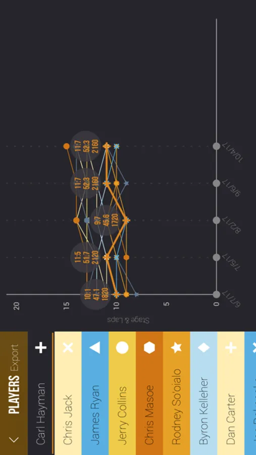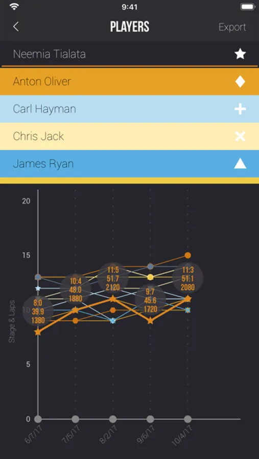 ‣ View past scores (Stage and level, VO2 Max and total distance) on a graph for all player profiles or highlight a single profile to show detailed score information.