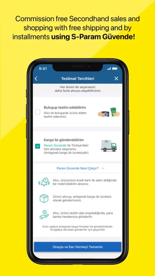 • You can buy all new and used items that you can think of from clothing and accessories to electronics, from home decors to gardening & DIY using Param Guvende (My Money is Safe) Service in person or various shipping options, and get deals and campaigns. You can sell the items that you no longer use and turn into profit using Param Güvende (My Money is Safe) Service.