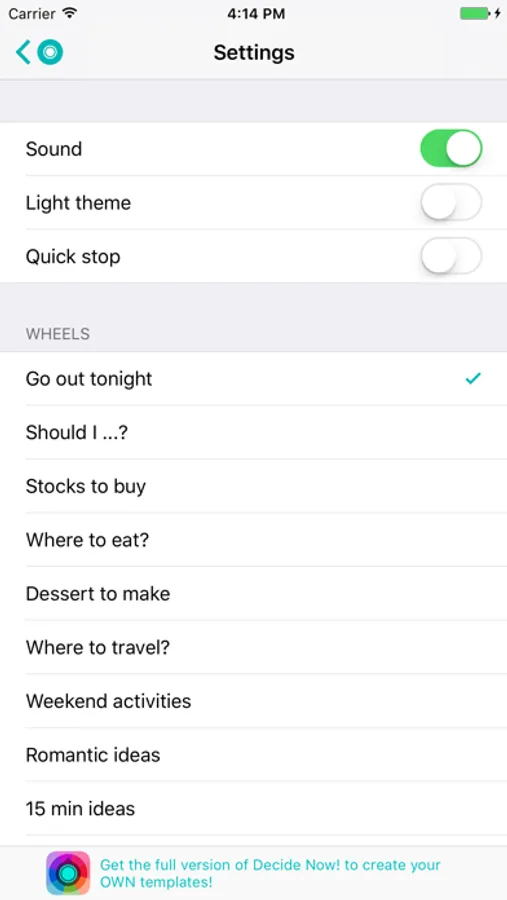 The Lite Version of Decide Now! has 8 predefined wheel templates. Please check out our full version to choose from your OWN creative ideas!