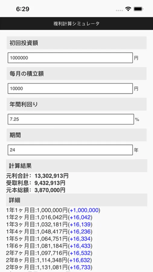 初回投資額、毎月の積立額、年間利回り、期間を入力すると、