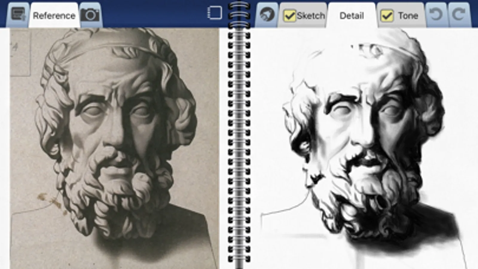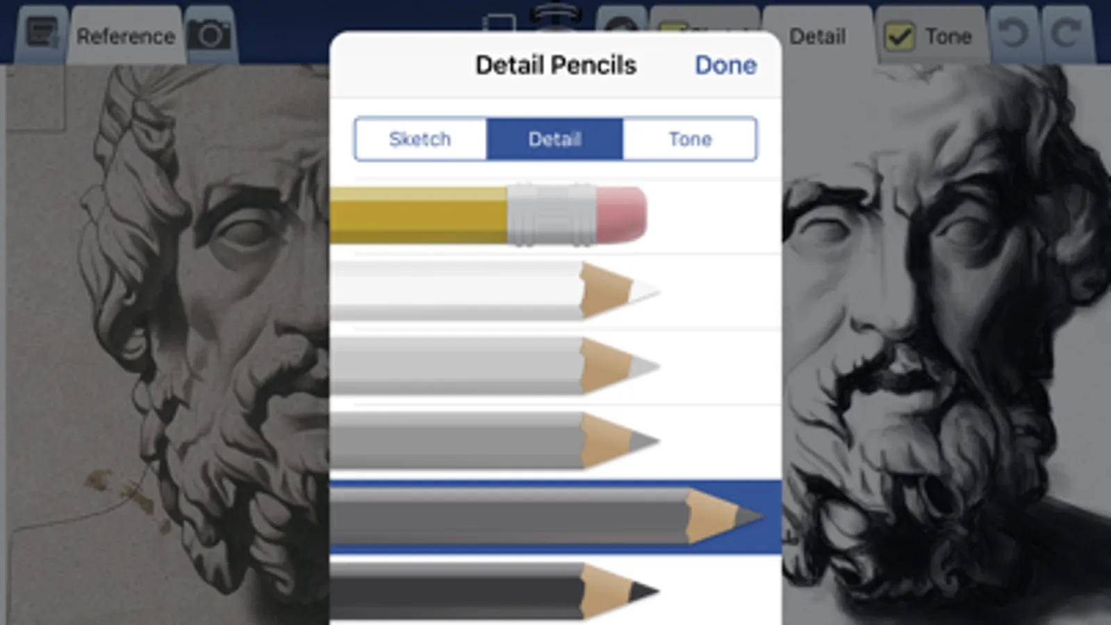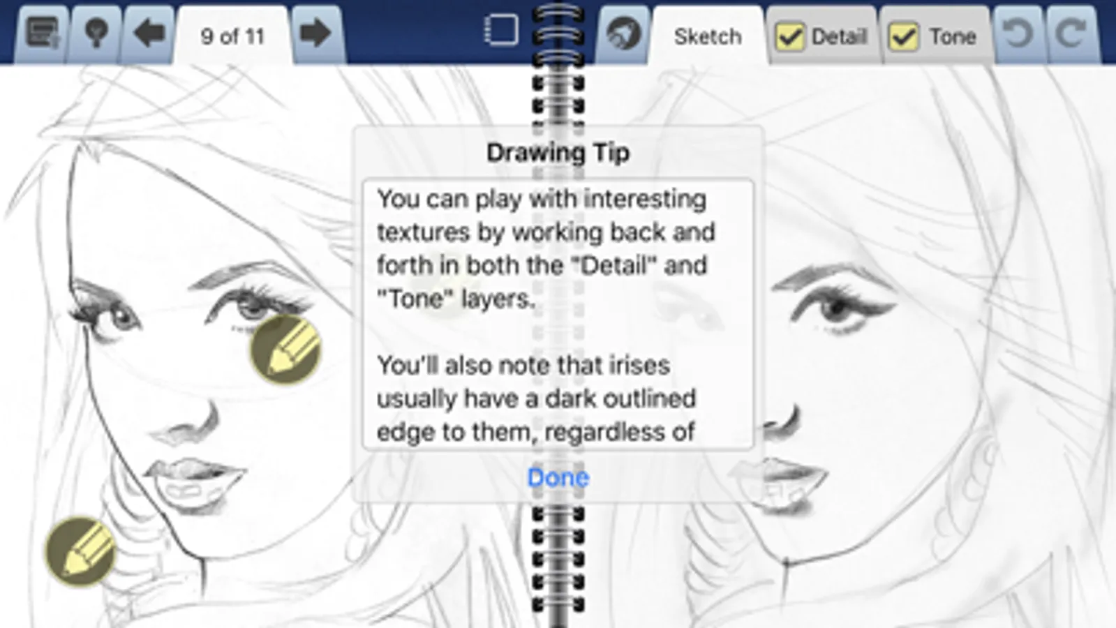 The application has 4 different interactive tutorials that guide you through the steps of creating great portraits. Follow along with Busch at your own pace across 11 visual steps and see every pencil stroke he makes. For more specific guidance, touch an area within a step to reveal Busch’s detailed tips. (Over 3 dozen detailed tips per tutorial!)