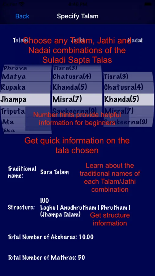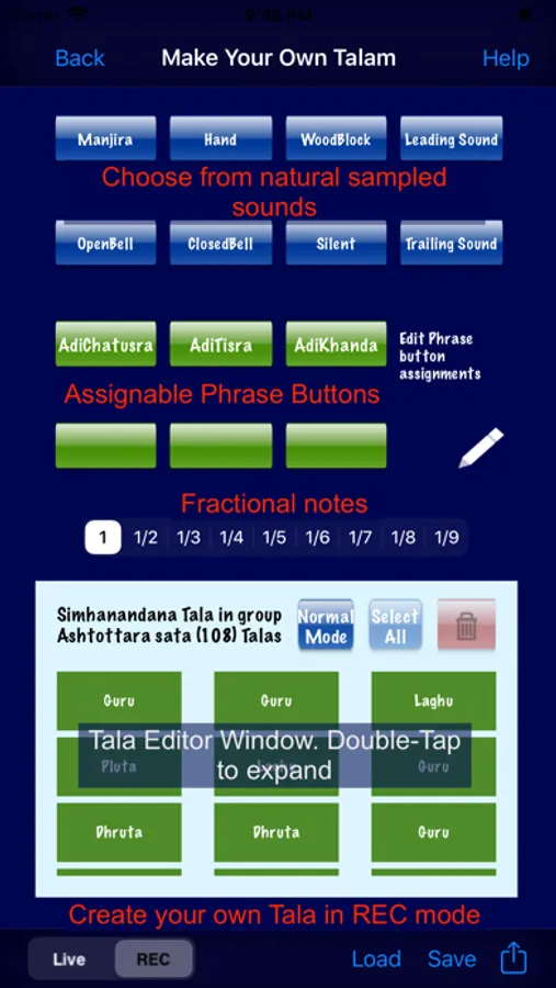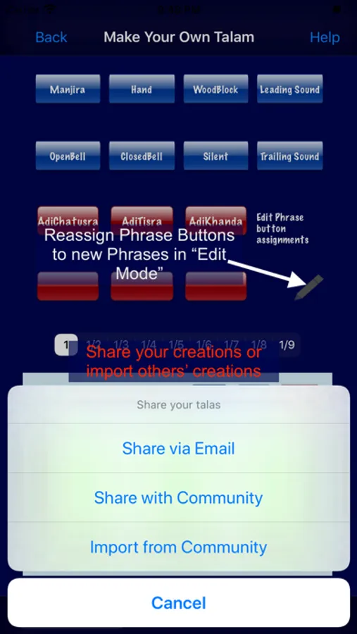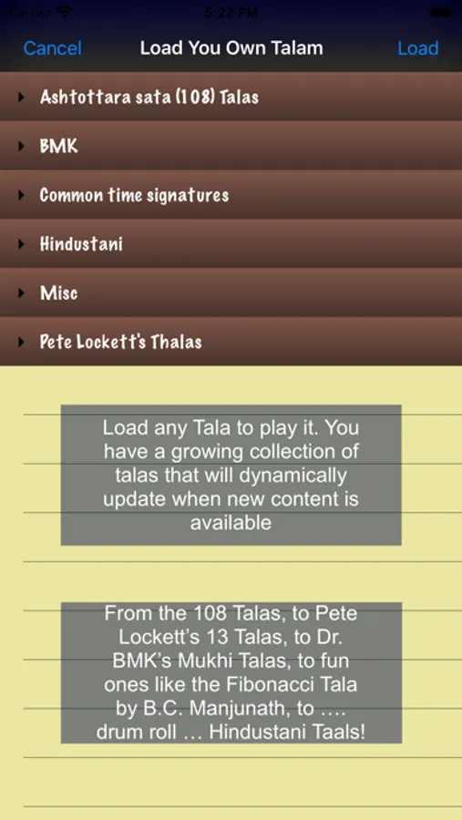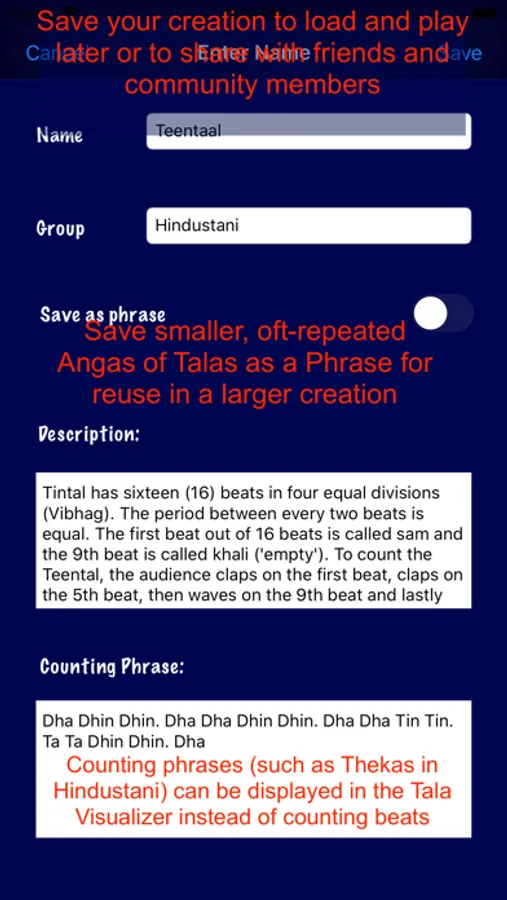 * "Make Your Own Talam/Choose Your Own Talam" lets you explore more exotic talas and beats from other genres by transcribing them easily with our Tala Editor. Importing and exporting talas are a breeze, and you can share easily via email.