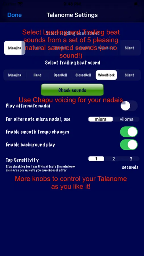 You are not restricted to Carnatic Music however - The “Choose/Make Your Own Talam” feature lets you create *any* beat sequence you like, or choose from an ever expanding library! Use the “Live” mode to provide the tala in real time in a Bhajan or Bharatanatyam setting.