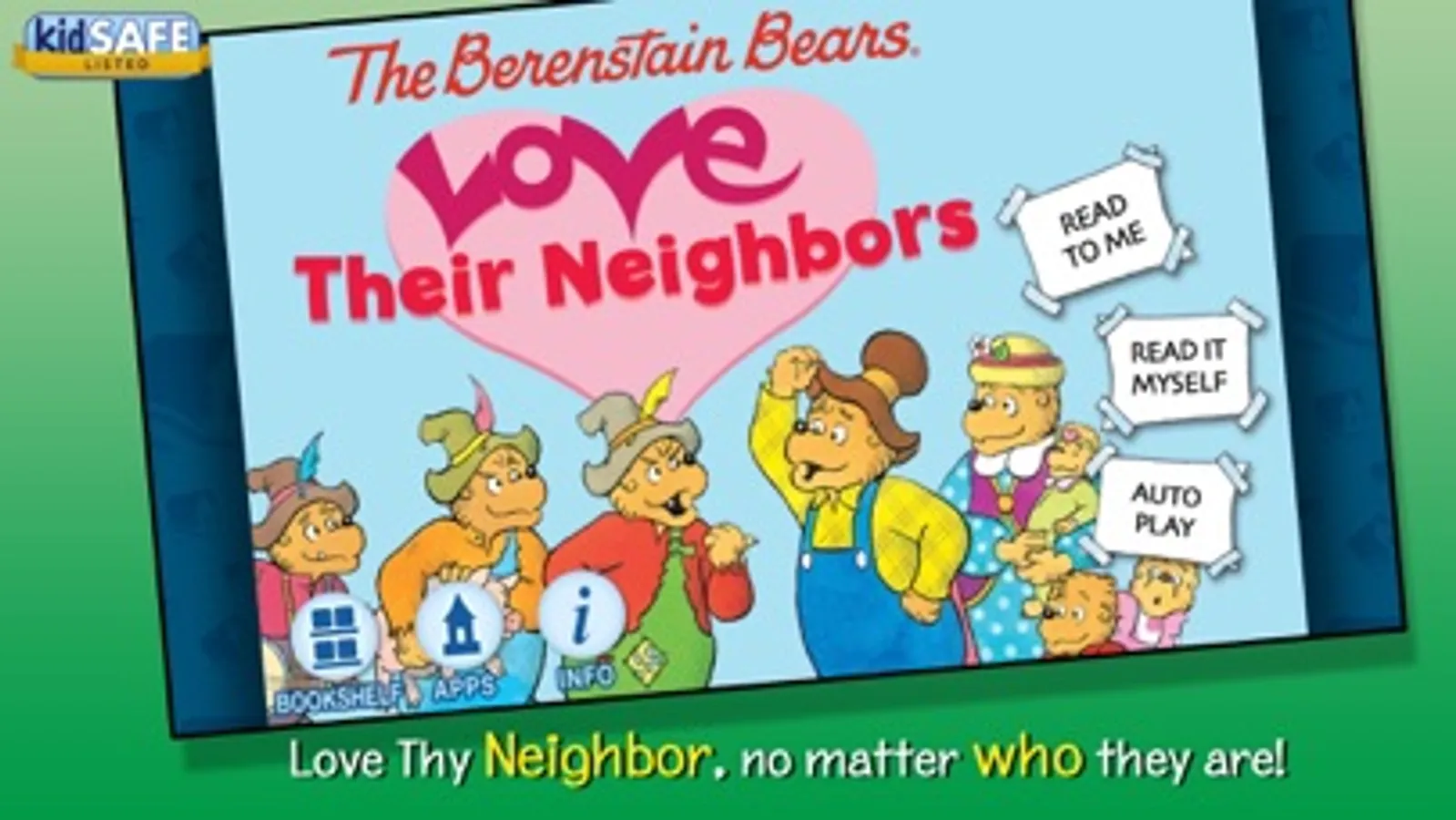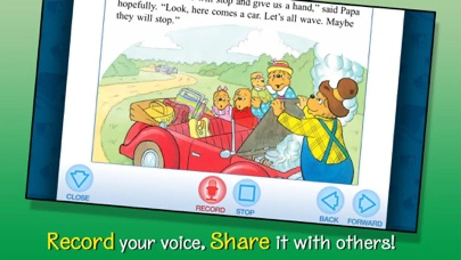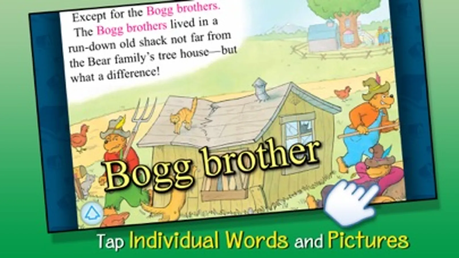 Join the Berenstain Bears in this interactive Christian book app as they help out their neighbors the Bogg Brothers who live in a run-down shack. Explore pictures, learn new vocabulary, and personalize the story with your own narration. Jump inside to learn an important lesson about finding and giving help in unexpected places.