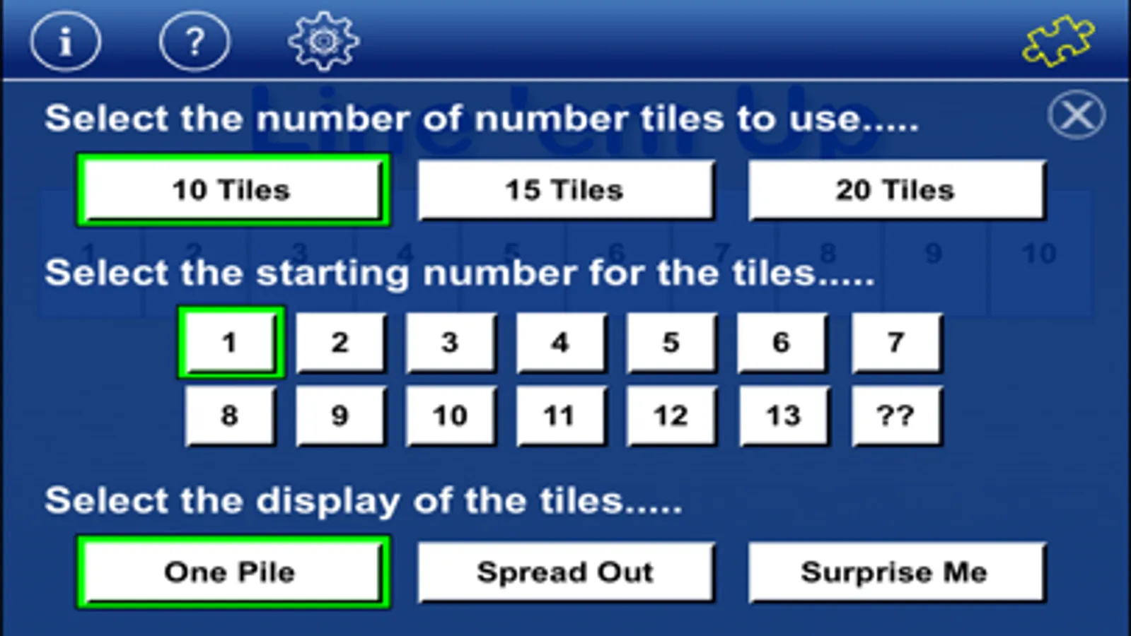 Options include using 10, 15, or 20 number tiles and designating a range of beginning numbers.