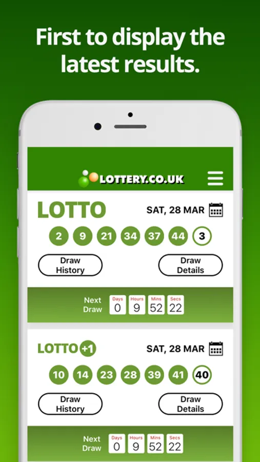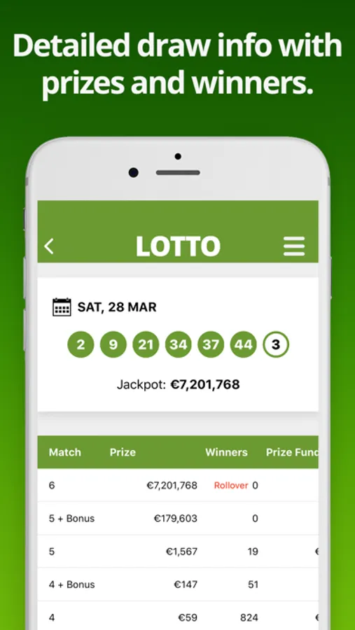 Get the latest Irish Lotto results within seconds of the draw taking place. This easy to use app shows the National Lottery numbers and full prize breakdowns including number of winners and prizes paid for the following lotteries: