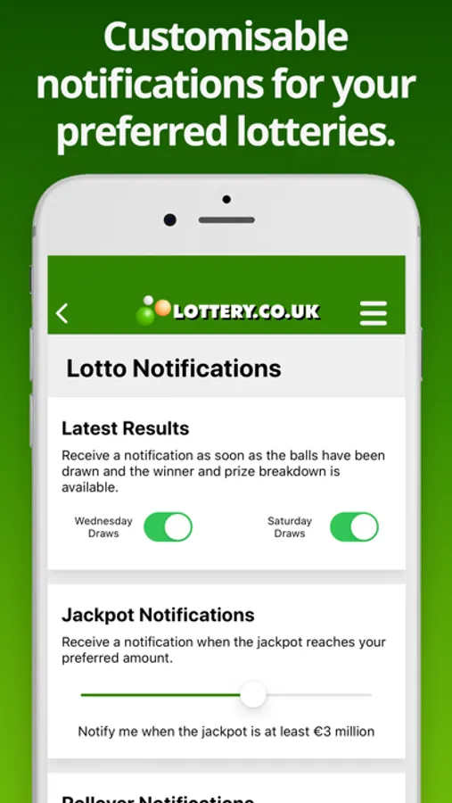 Get notified instantly when the latest lottery results and prize breakdowns become available. The App allows you to customise notifications for specific lottery games and you can also choose which days of the week you play. Want to know when the jackpot has rolled over or has reached a certain amount? Just head to the Notification section of the app to set up your alerts. There is also the option to set notifications at times that suit you - great for reminding you to purchase tickets before the draw.