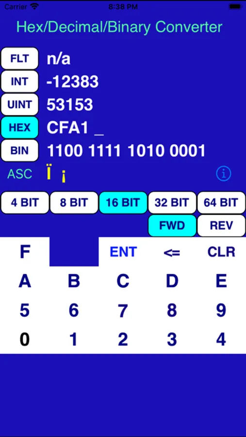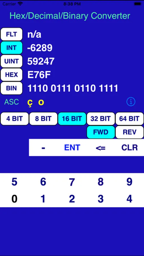 Numbers can be entered in 4-, 8-, 16-, 32- and 64-bit formats. The ASCII character codes for the numbers being converted will also be displayed.