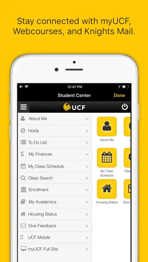 Check out the mobile version of some of the myUCF Student Self Service options. Update your personal information, direct deposit, and manage your class enrollment. View your class schedule, grades, holds and to-do list, advisors, financial aid, account information, and housing status.