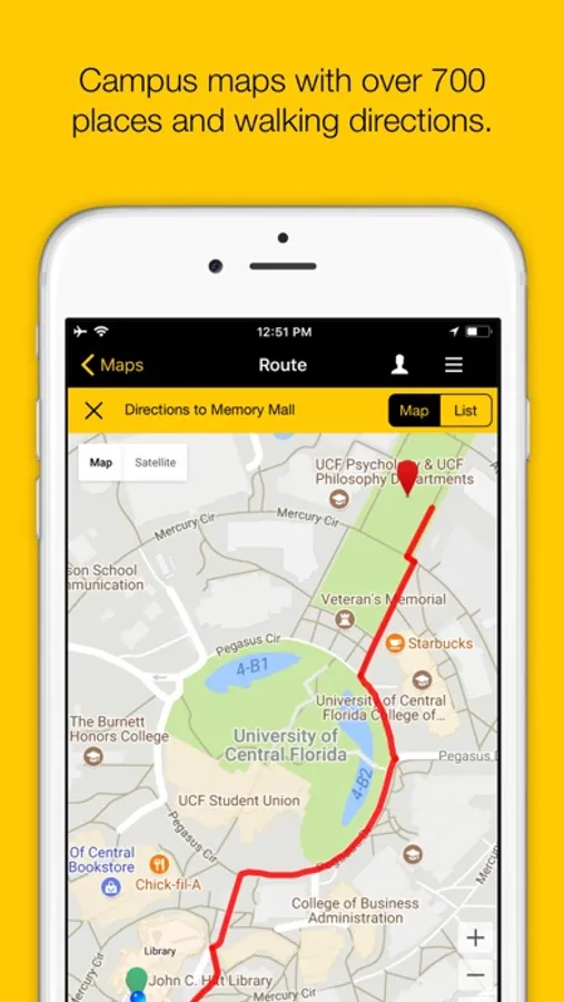Over 700 points of interests which include buildings, departments, services, parking, dining, retail, and much more. Other features include what's nearby, GPS location, and walking directions.
