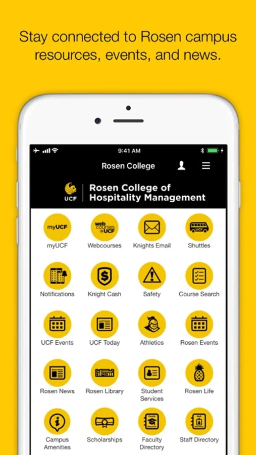 This experience includes quick access to myUCF, Knights Mail, Webcourses, Shuttles, and resources specific to Rosen students, faculty, and staff.