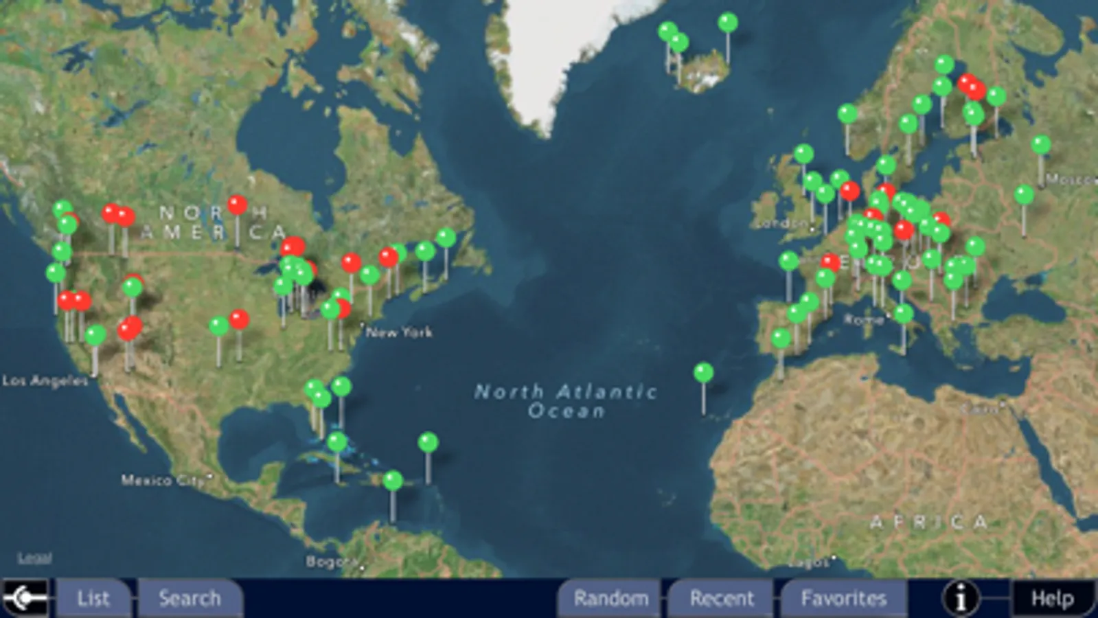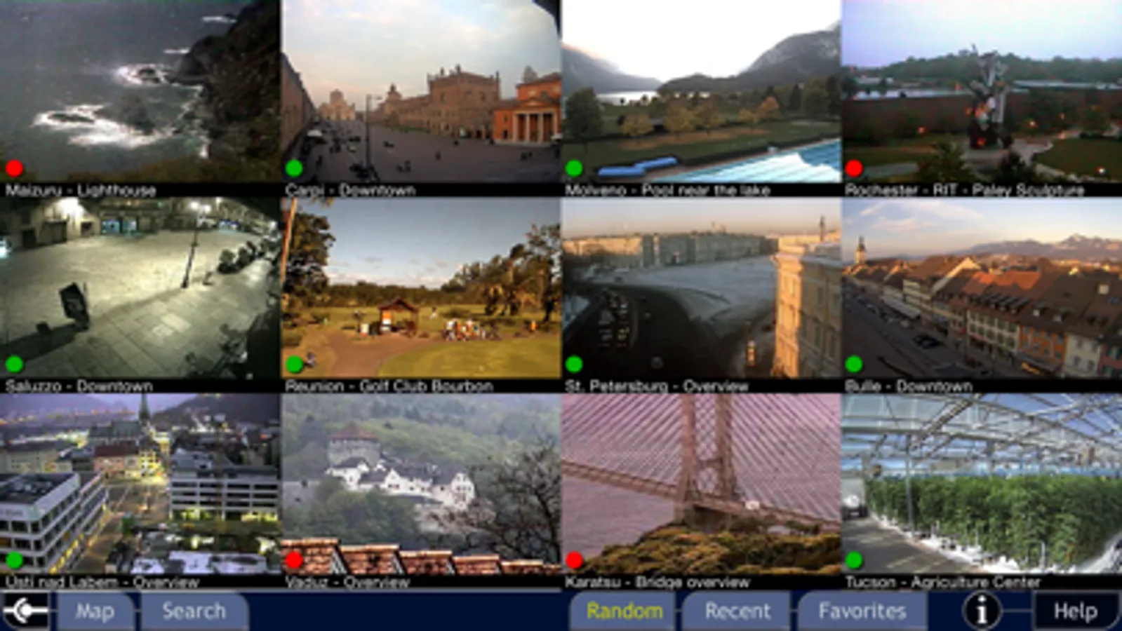 Choose from among several different ways to navigate: location map, location list, random, recent, and favorites. The simple search system lets you filter selected webcams, individually or in combination, by state, city, and subject.