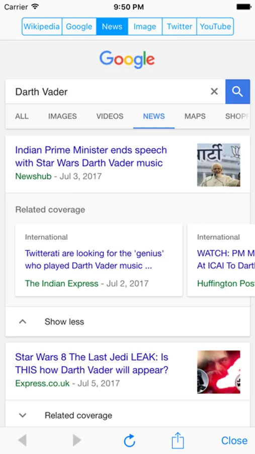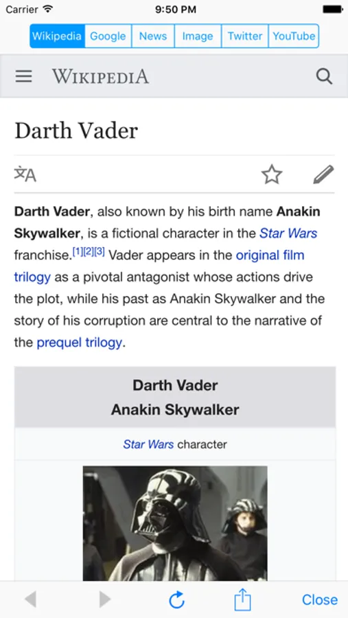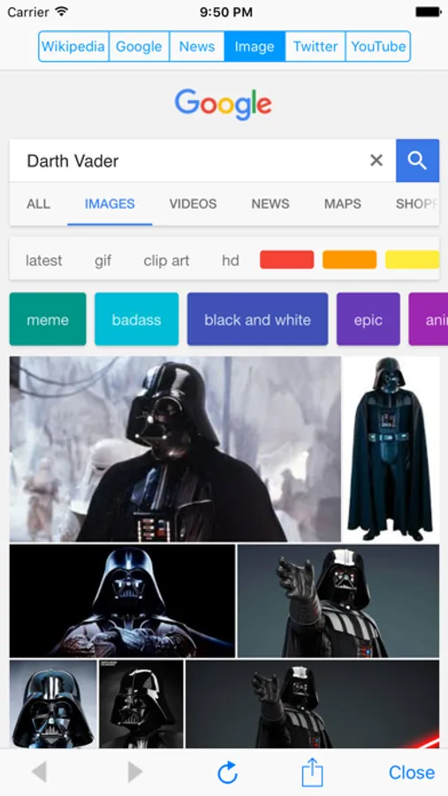 By tapping the keyword, you can search the related page of Wikipedia, News, Images, or Twitter.
