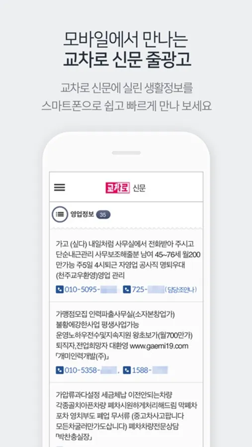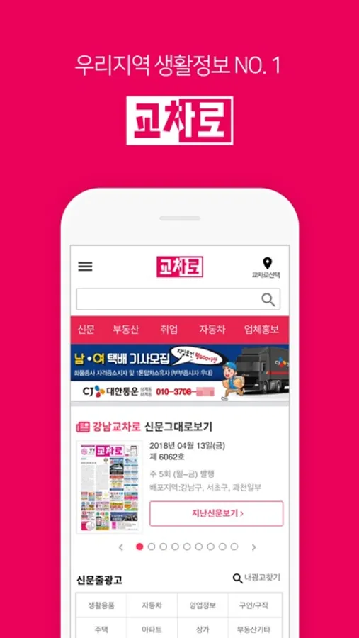 『대한민국 최초』 생활정보 신문 교차로에 실린 생생한 부동산, 취업, 영업, 산행, 생활용품 관련 정보를 스마트폰으로 빠르고 쉽게 만나 보세요.