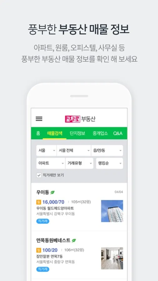 아파트, 원룸, 오피스텔, 사무실 등 전국 부동산 매물 정보를 확인 해 보세요.
