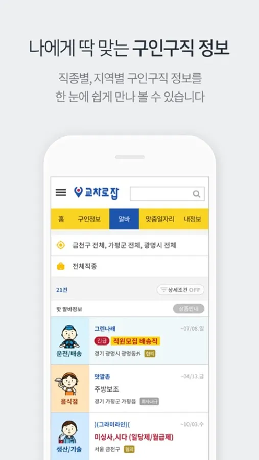 나에게 딱 맞는 직종별 지역별 구인구직, 알바 정보를 확인 해 보세요.