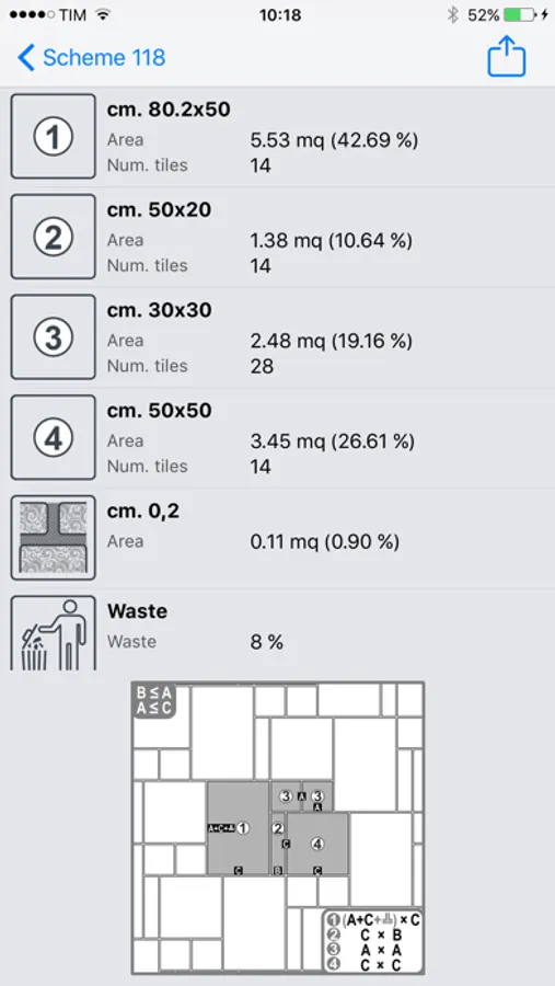 Maticad Tile Calculator allows you to select a Floor laying scheme among 172 available, most typical schemes within the ceramic tiles market. Once selected the scheme, you can specify tiles dimensions, grout and waste factor in order to get needed quantity and percentage for each tile. The results can be easily shared by e-mail from within the App, if a valid account is available.