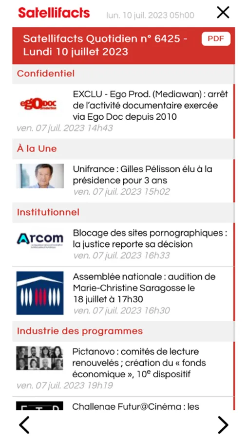 - Satellifacts quotidien (chaque matin à 5h du lundi au vendredi), une lettre maquettée (pdf) en ligne qui reprend et complète le fil info de la veille.