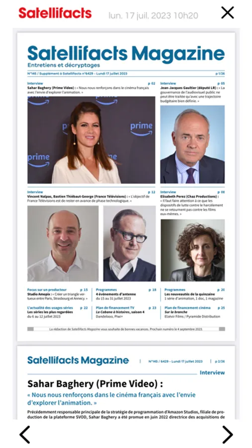 - Satellifacts Magazine (un lundi sur deux, en alternance avec Satellifacts Talents) : interviews audiovisuel et cinéma, plans de financement TV et cinéma, plans marketing de sortie des films, actualité des usages séries, focus programmes, producteurs et start-up etc.
