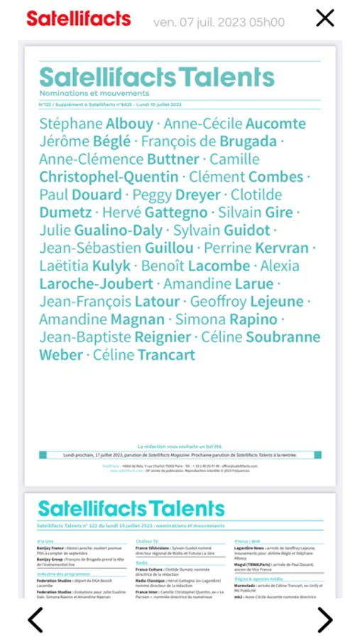 - Satellifacts Talents (un lundi sur deux, en alternance avec Satellifacts Magazine) : nominations, mouvements et parcours professionnels.