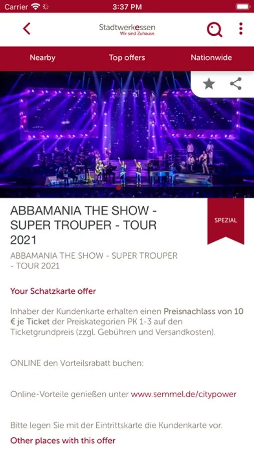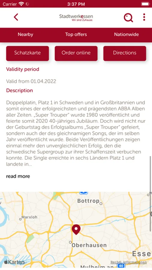 Mit der Schatzkarte App können Sie als Karteninhaber jetzt noch bequemer bei über 2.000 Partnern in Deutschland und Europa satte Rabatte kassieren. Die App zeigt Ihnen, wo Sie welchen Rabatt mit Ihrer Kundenkarte erhalten. Egal ob Freizeit, Kultur, Musical oder Sport: Mit dem Wegweiser für satte Rabatte entgeht Ihnen keine Möglichkeit, bares Geld zu sparen. Sehen Sie auf einem Blick alle Sparangebote an Ihrem aktuellen Aufenthaltsort, in Ihrem Umkreis oder an einem Ort Ihrer Wahl. Einfach Angebotssuche starten, Vorteilspartner anzeigen lassen und das Angebot aufrufen. Machen Sie sich am besten direkt per Routenplanung auf den Weg ins Sparvergnügen. Vor Ort erhalten Sie und Ihre Familie gegen Vorlage der Schatzkarte Ihren Sofortrabatt!