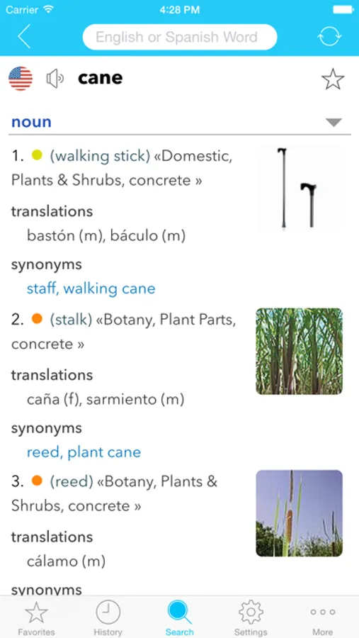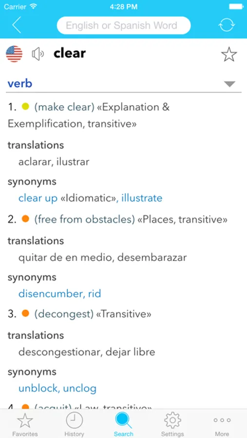 • Natural-sounding voices for entries, definitions and examples in both languages (British and American English, European and American Spanish)